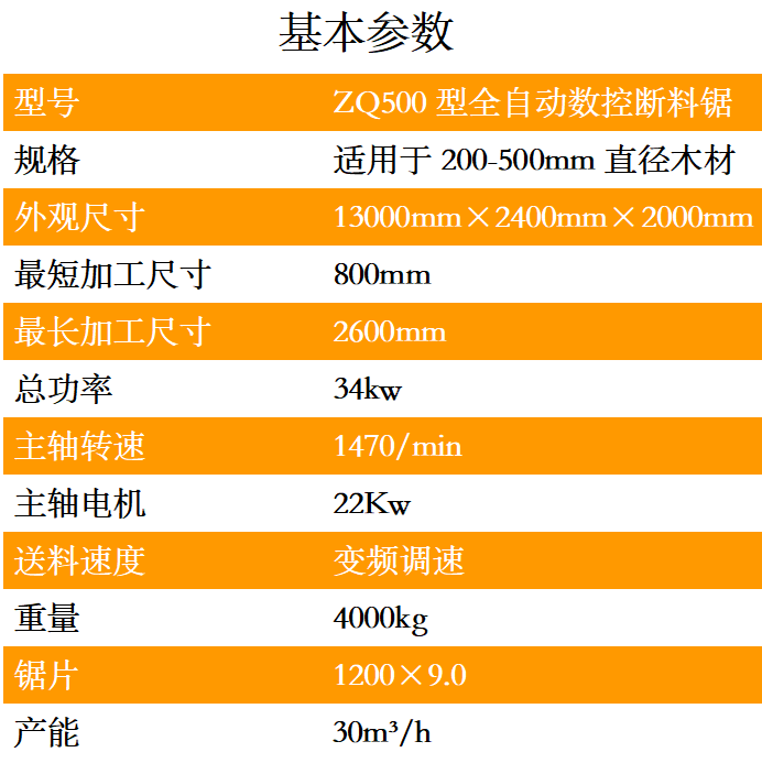 全自动数控断料锯是一种用于截断圆木的专用机械,可取代传统的断木设备。本机是左右锯设计,采用手自一体的液压驱动,PLC数字控制系统,只需一名普通工人便可轻松操控,稳定性高,加工表面平整光洁,公差在2MM之内,截断范围可以随意调节。加工长度和速度均可根据实际所需规格随意调节,效率高,是传统截断机的2-5倍。锯片配进口合金锯片,使用寿命长.适用于原生木材,板材板方的切断加工.本设备采用输送台自动进料,自动感应压料,自动截断,输送台自动出料等先进装备,具有操作简单,安全,效率快,切断长短可随意设定,省时省工,大大减轻操作者劳动强度等优点.
