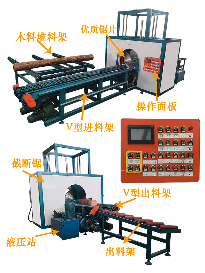 全自动数控截断锯是一种用于截断圆木的专用机械,可取代传统的断木设备。本机是上下锯设计,采用手自一体的液压驱动,PLC数字控制系统,只需一名普通工人便可轻松操控,稳定性高,加工表面平整光洁,公差在2MM之内,截断范围可以随意调节。加工长度和速度均可根据实际所需规格随意调节,效率高,是传统截断机的2-5倍。锯片配进口合金锯片,使用寿命长.适用于原生木材,板材板方的切断加工.本设备采用输送台自动进料,自动感应压料,自动截断,输送台自动出料等先进装备,具有操作简单,安全,效率快,切断长短可随意设定,省时省工,大大减轻操作者劳动强度等优点.