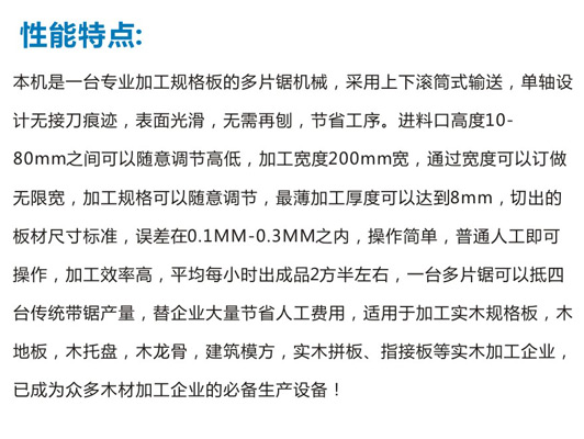本机是一台专业加工规格板的多片锯机械,采用上下滚筒式输送,单轴设计无接刀痕迹,表面光滑,无需再刨,节省工序,进料口高度10mm到50mm之间可以随意调节高低,加工宽度200mm宽,通过宽度可以订做成无限宽,加工规格可以随意调节,最薄加工厚度可以达到8mm,锯切出的板材尺寸标准,误差在0.1mm-0.3mm之间。操作简单,普通工人就可操作,加工效率高,平均每小时出成品2立方半左右,一台多片锯可以抵四台传统带锯产量。替企业节省了大量的人工费用,适用于加工实木规格板、木地板、木托盘、木龙骨、建筑模板、实木拼版、指接板等实木加工企业。本设备已成为众多实木加工企业的必备生产设备。
